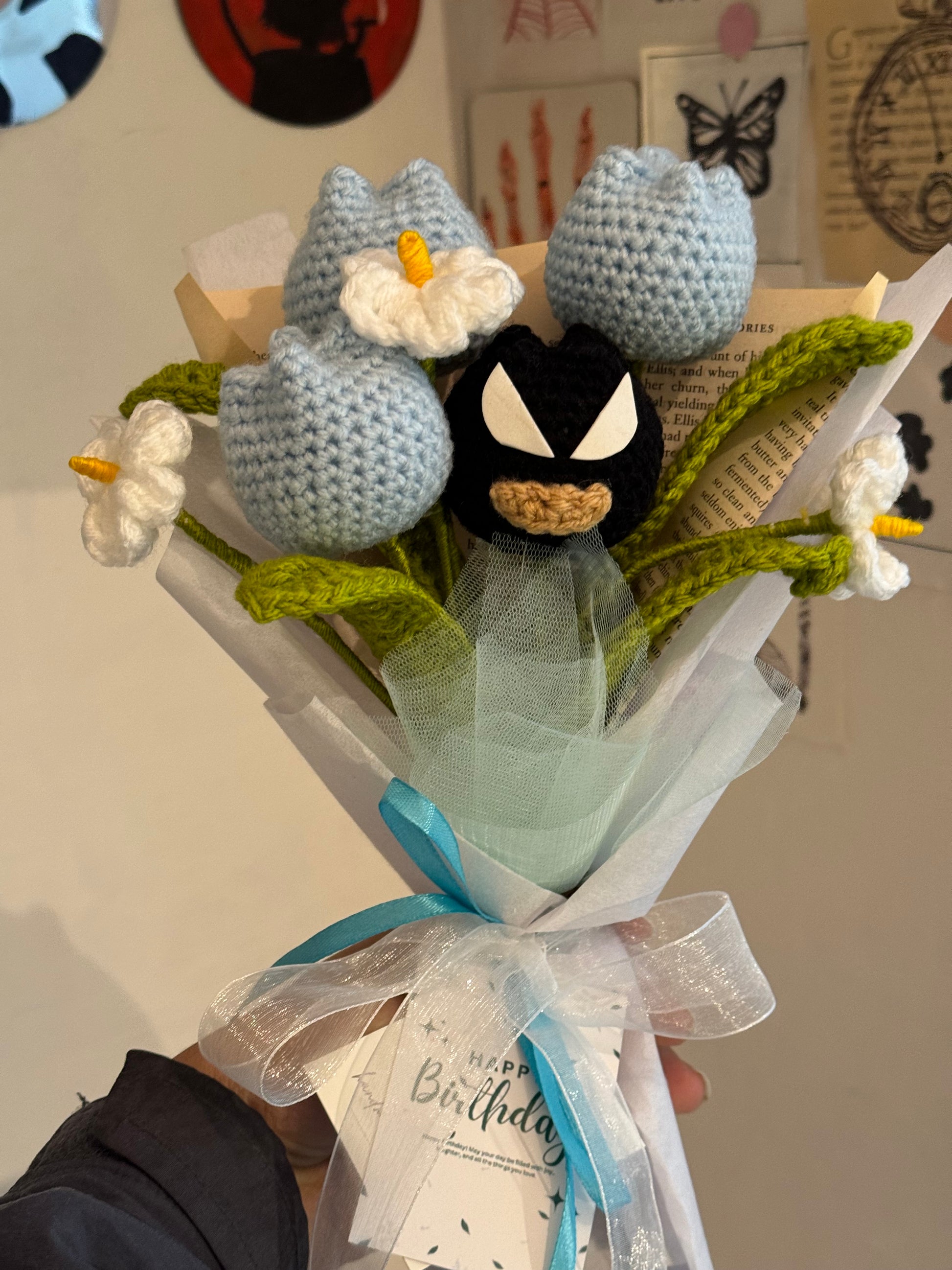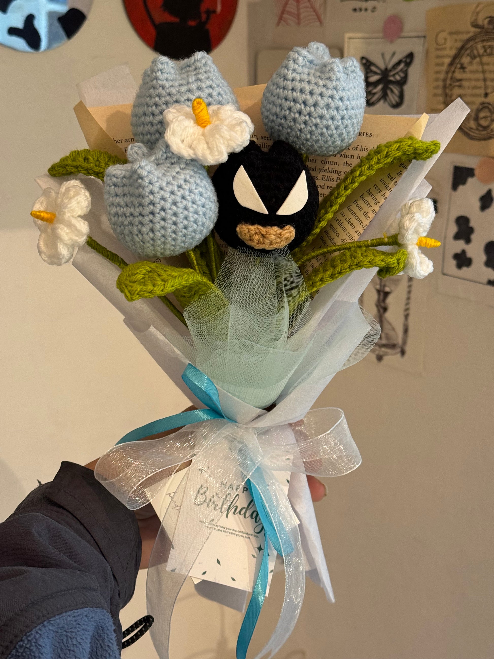 Mysterious, bold, and undeniably striking, Dark Knight is a crochet bouquet that exudes strength and elegance. Featuring three soft blue tulips, delicate forget-me-nots, and a unique black tulip resembling Batman, this arrangement is a tribute to those who embrace both charm and courage. Wrapped in an enchanting blend of tulle, ribbons, and book-page detailing, this handcrafted bouquet is a statement piece that lasts forever.