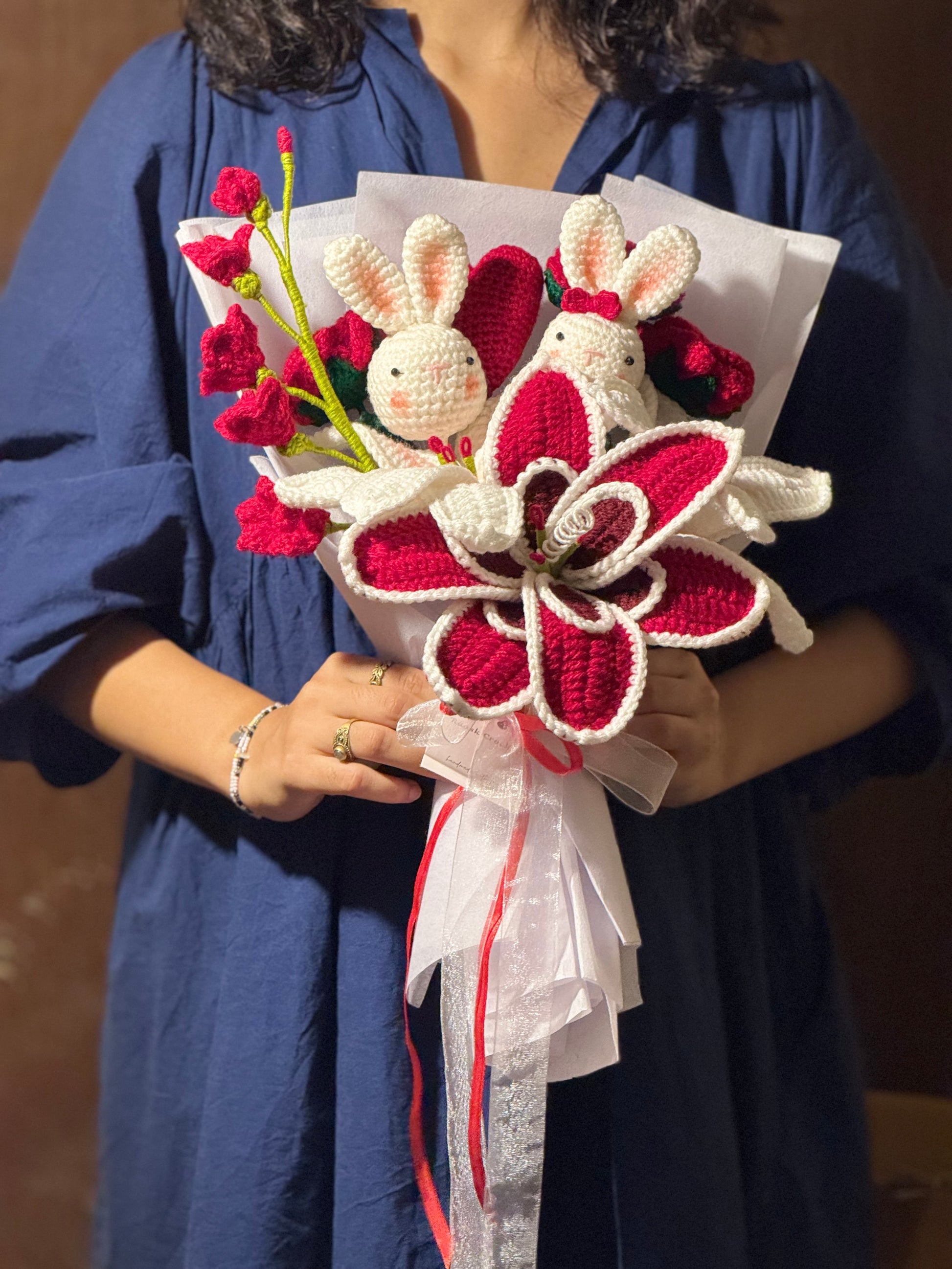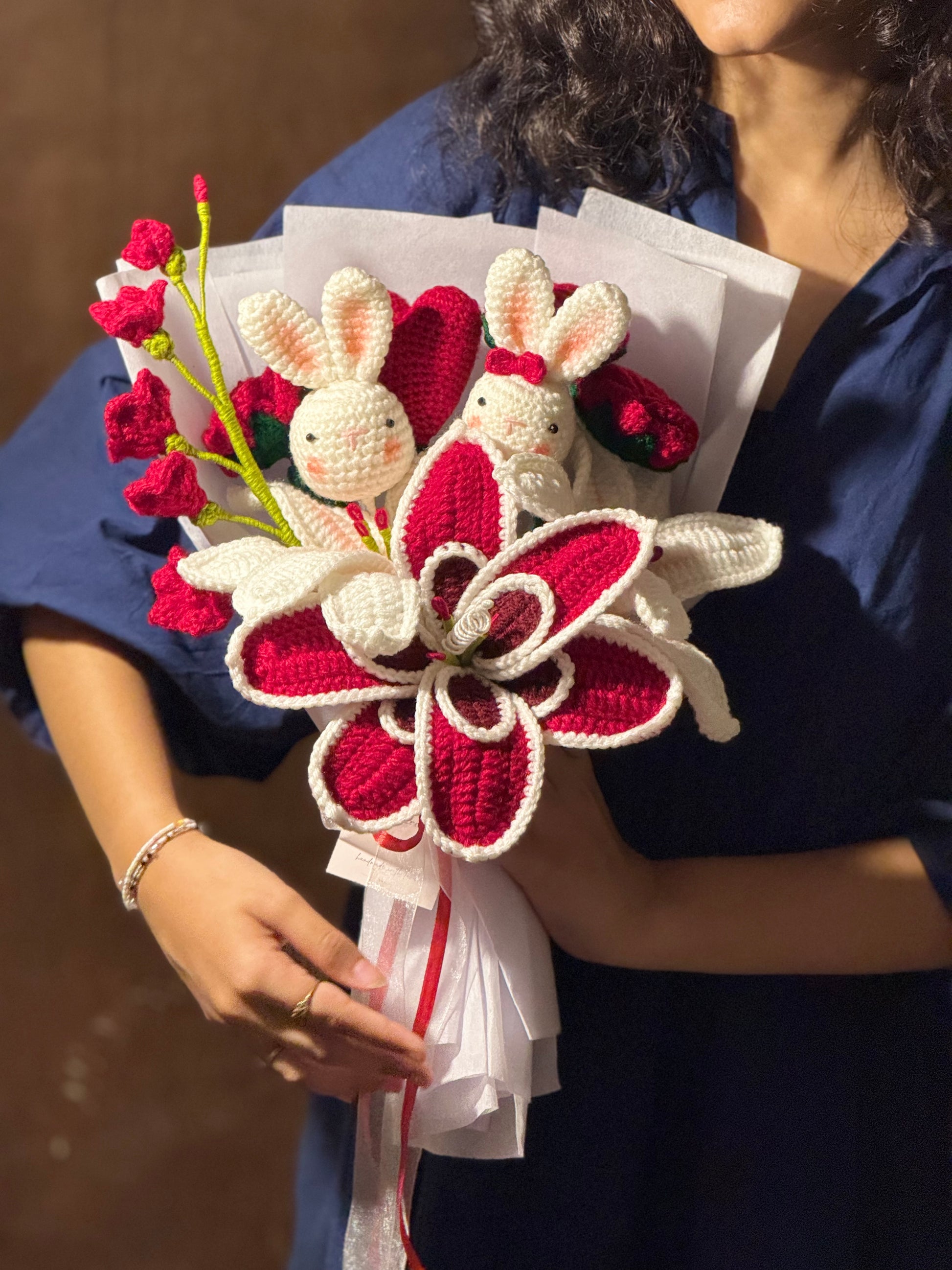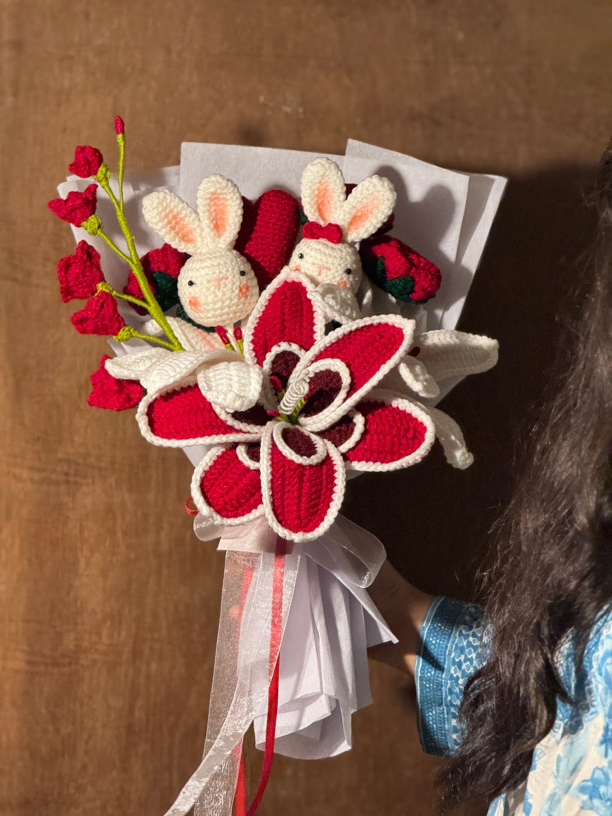 A handcrafted crochet bouquet featuring two adorable bunny dolls nestled among beautifully crocheted flowers. The bouquet combines red and white tones, symbolizing love, purity, and warmth. Unlike real flowers, this unique arrangement is everlasting, making it a perfect gift for birthdays, anniversaries, Valentine’s Day, or simply to express love and care.