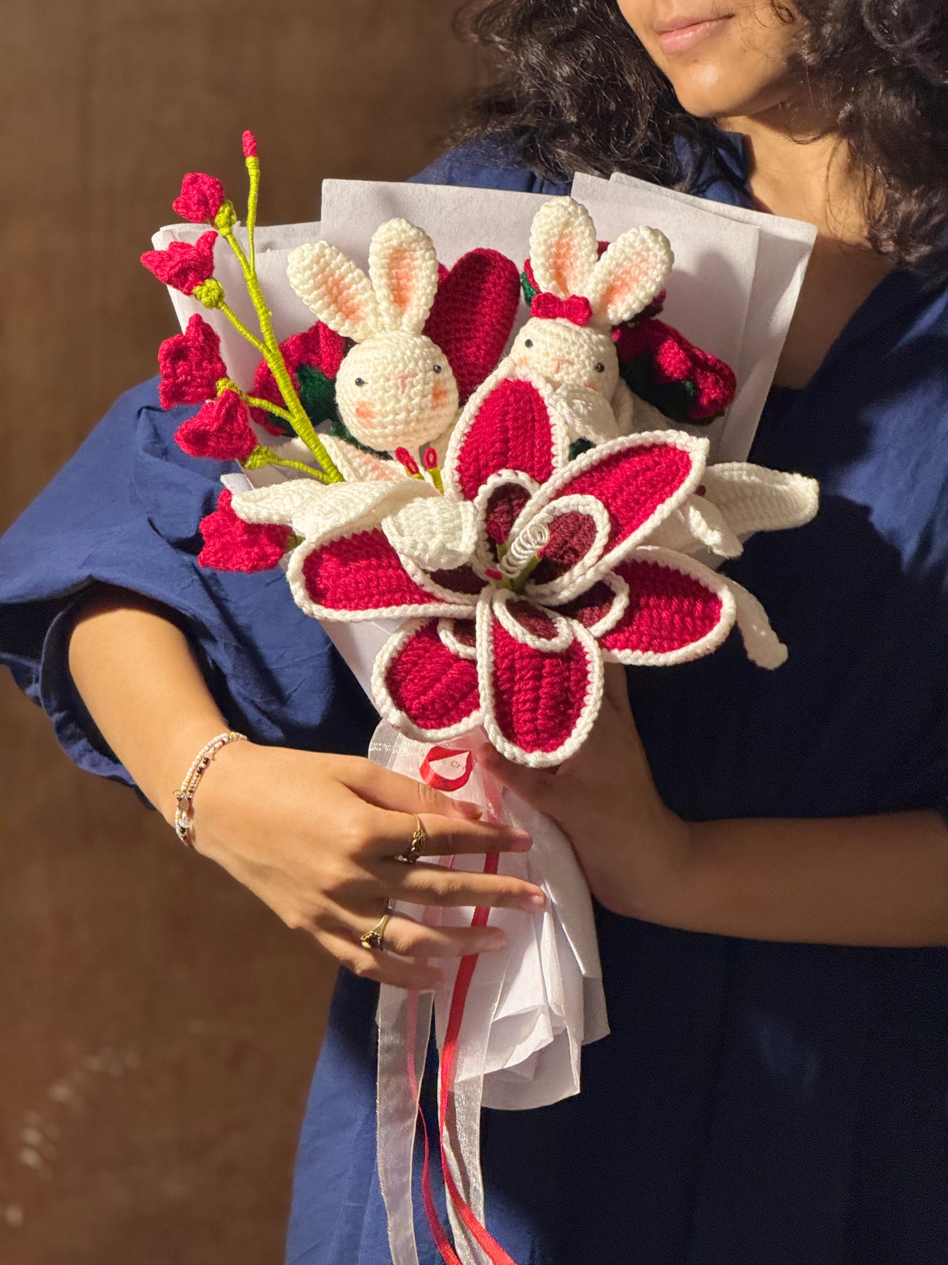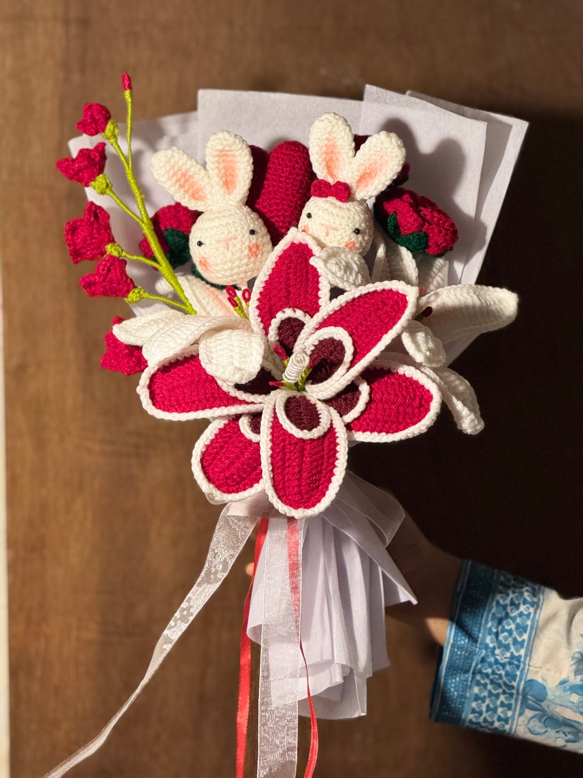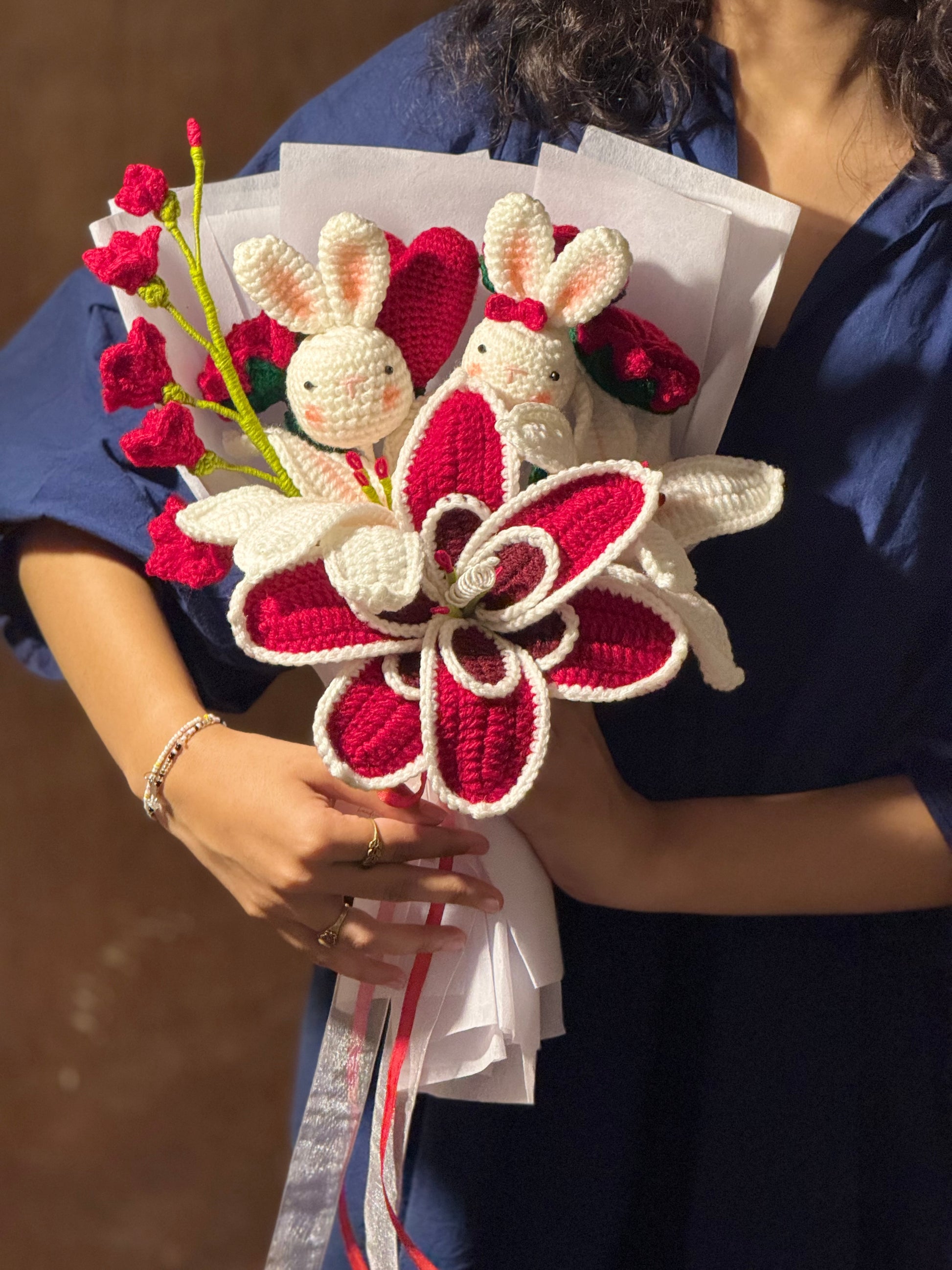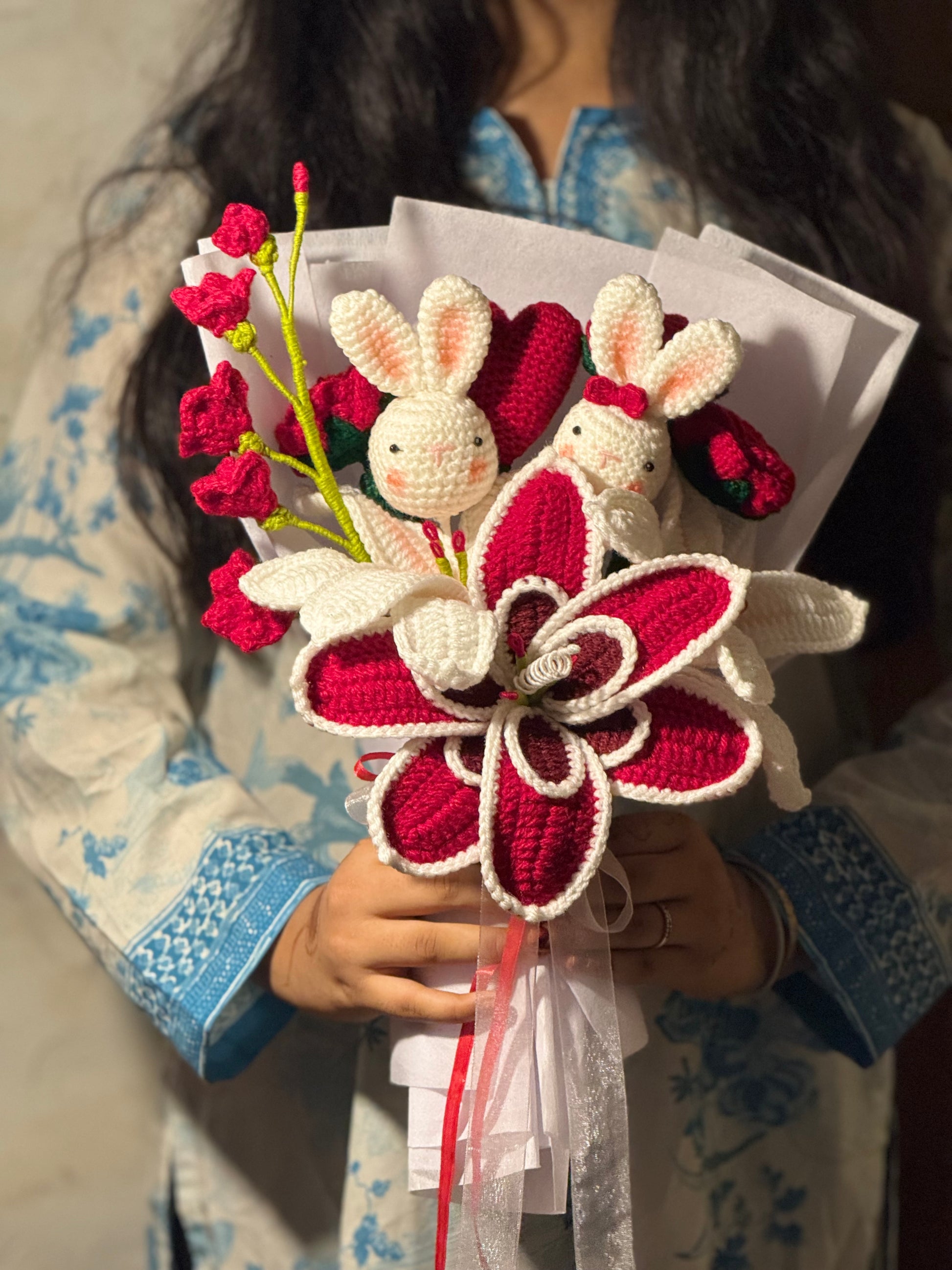 A handcrafted crochet bouquet featuring two adorable bunny dolls nestled among beautifully crocheted flowers. The bouquet combines red and white tones, symbolizing love, purity, and warmth. Unlike real flowers, this unique arrangement is everlasting, making it a perfect gift for birthdays, anniversaries, Valentine’s Day, or simply to express love and care.