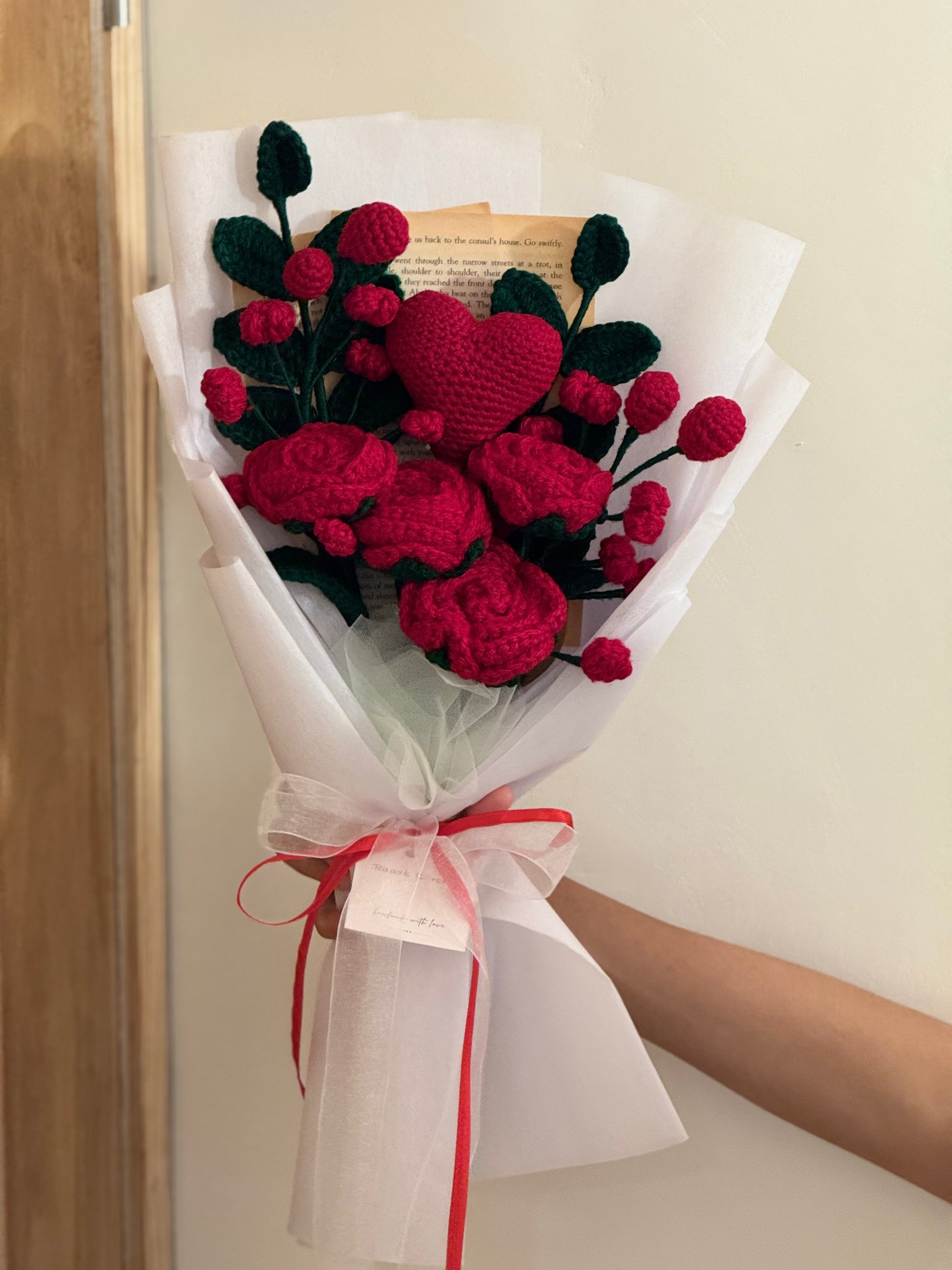 A beautifully handcrafted crochet flower bouquet made with love and attention to detail. Featuring rich red crochet roses, heart-shaped accents, and delicate buds, this bouquet is wrapped elegantly to give a premium, gift-ready look. Unlike real flowers, this bouquet never fades—making it a perfect keepsake for birthdays, anniversaries, proposals, Valentine’s Day, or just to say “I love you.” Soft, durable, and timeless, it’s a gift that lasts forever.