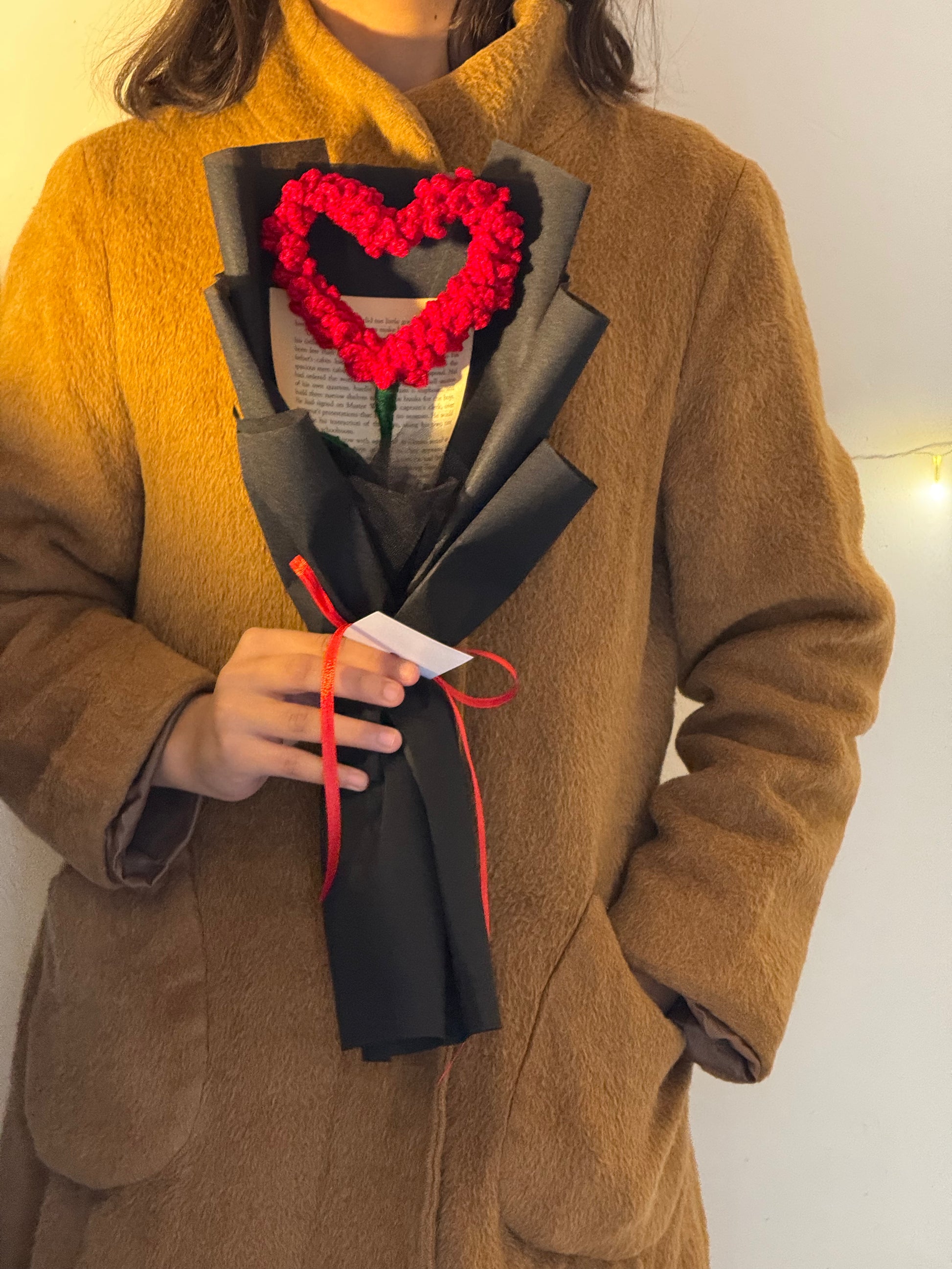 Make gifting extra special with this handmade crochet heart rose bouquet. It features a bold red heart-shaped rose design with a green stem, beautifully wrapped in premium black paper and finished with a red ribbon—perfect for birthdays, anniversaries, proposals, Valentine’s Day, or just to say “I love you.” Unlike real flowers, it stays forever and looks just as stunning on display.