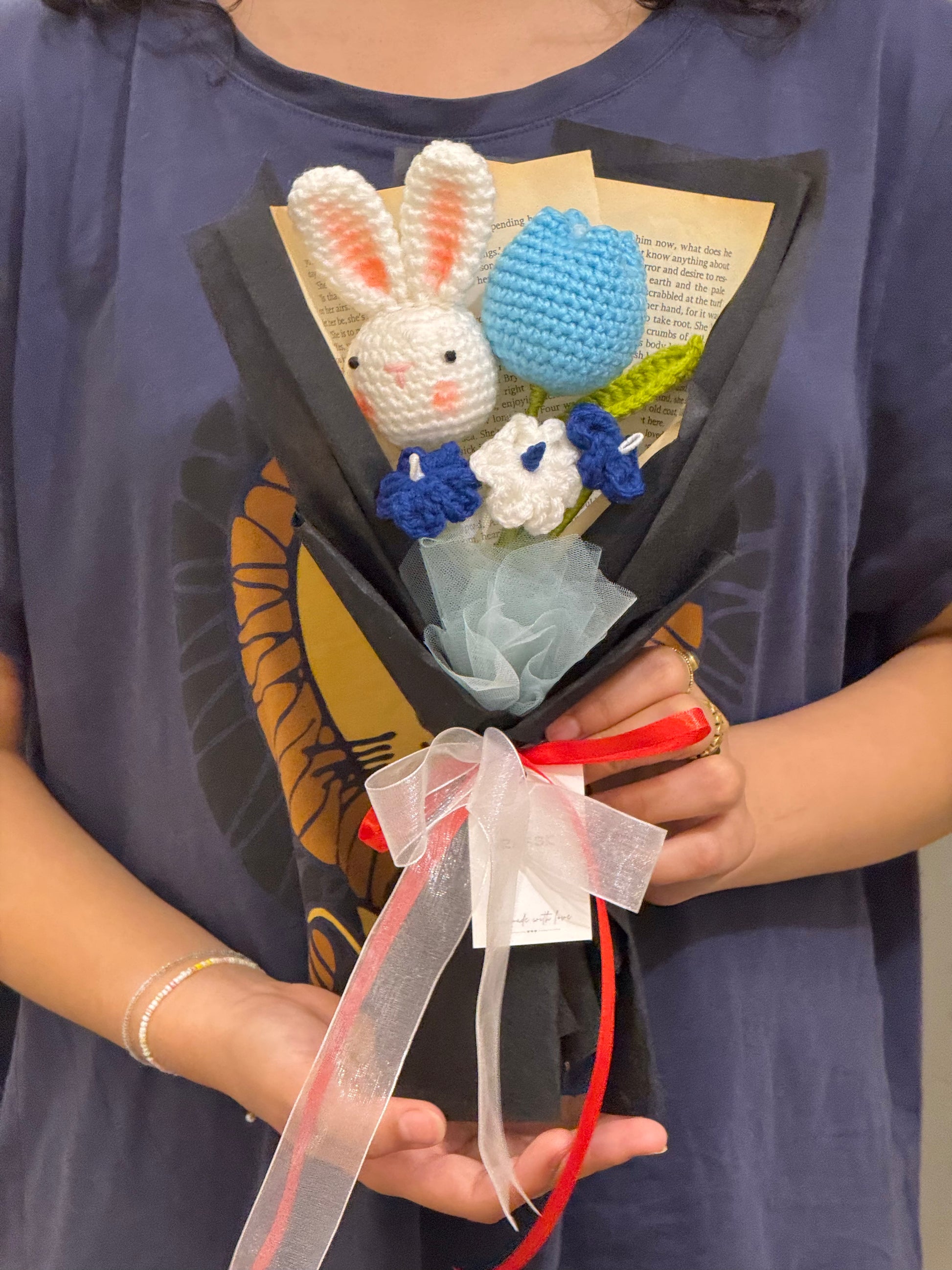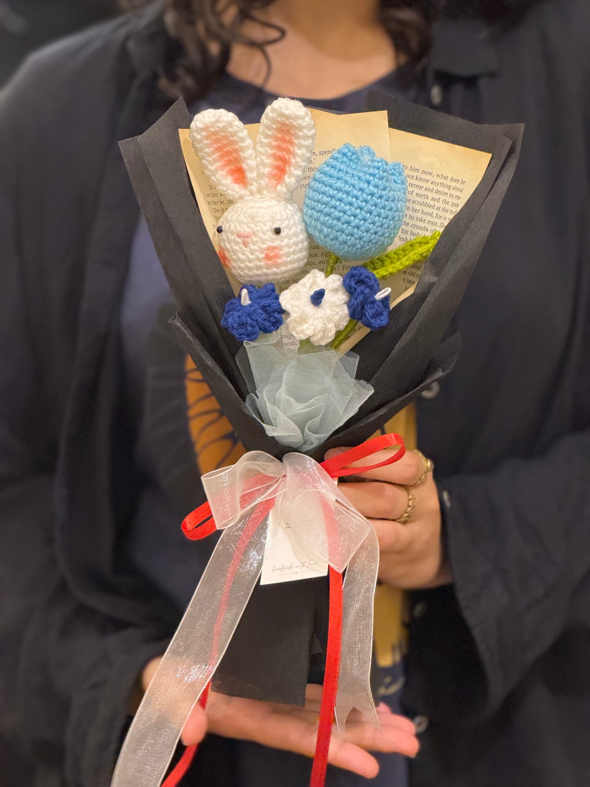 Soft, delicate, and full of charm—Petal Paws is a heartwarming bouquet featuring a single handcrafted rose, three dainty forget-me-nots, and an adorable bunny nestled among them. Wrapped beautifully in elegant white, this bouquet captures the essence of love and playfulness, making it a perfect keepsake or a thoughtful gift.